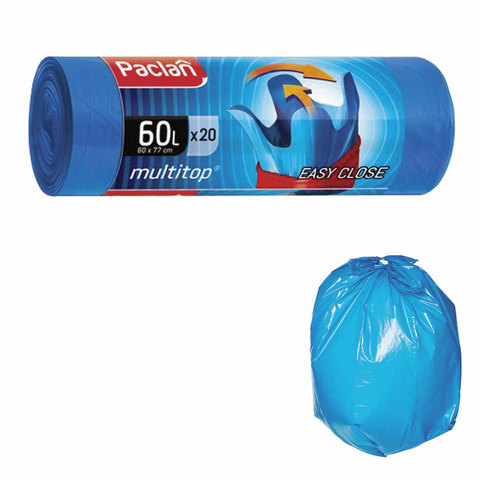 Мешки для мусора, 60 л, комплект 20 шт., рулон, ПВД, 60х77 см, 14 мкм, с ушками, синие, PACLAN "Multitop", 402092