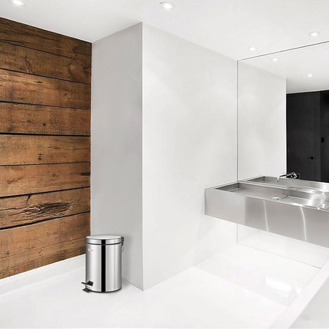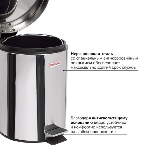 3 л - подходящий объем при малой проходимости. Оборудовано педалью для открывания. Крышка плотно прилегает, тем самым препятствуя распространению запахов. Внутреннее съемное пластиковое ведро имеет удобную рукоятку для извлечения. Изготовлено из нержавеющей стали со специальным антикоррозийным покрытием, что обеспечивает максимально долгий срок службы. Ведро устойчиво благодаря антискользящему основанию. Объем рекомендуемого мешка - 10 л. Контейнер для мусора в стальном цвете с зеркальным покрытием имеет компактные размеры (24х17х17 см) и отлично впишется в любой интерьер.