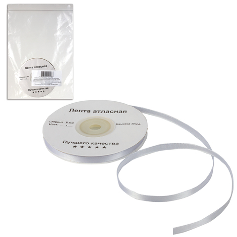 Лента обвязочная атласная для прошивки документов, ширина 6 мм, длина 25 м +/- 5%, белая, 603064