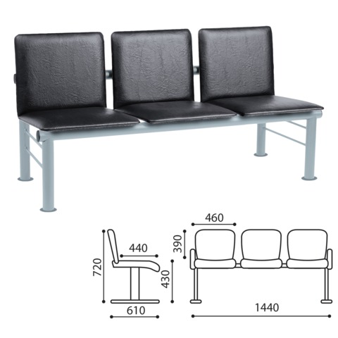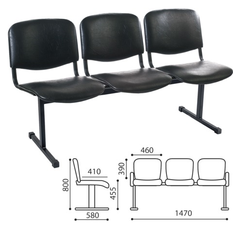 Кресло для посетителей трехсекционное "Тройка", 840х1420х560 мм, черный каркас, черный кожзам., СМ 91-03 К01