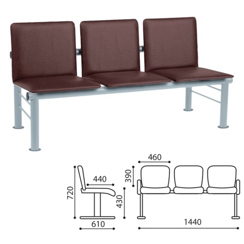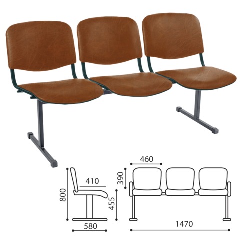 Кресло для посетителей трехсекционное "Трим", черный каркас, кожзам коричневый