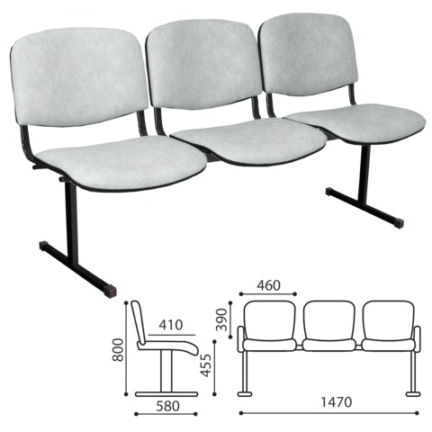 Кресло для посетителей трехсекционное "Трим", черный каркас, кожзам светло-серый