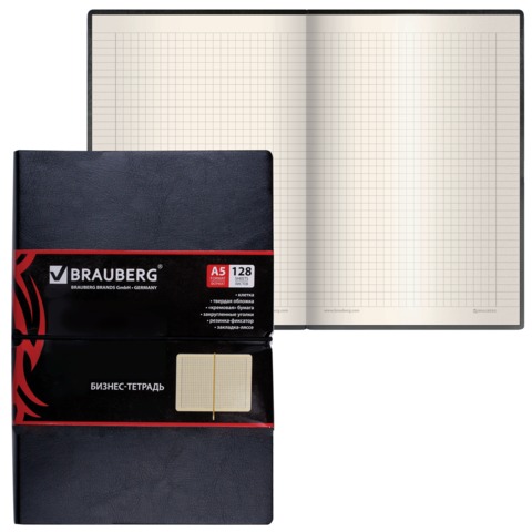 Бизнес-блокнот BRAUBERG, А5, 148х218 мм, "Black Jack", гладкий кожзам, резинка, клетка, 128 л., черный, 125240