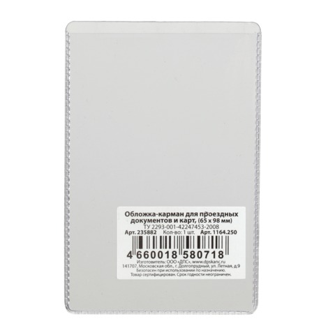 Обложка-карман для проездных документов и карт, ПВХ, прозрачная, 65х98 мм, ДПС, 1164.250