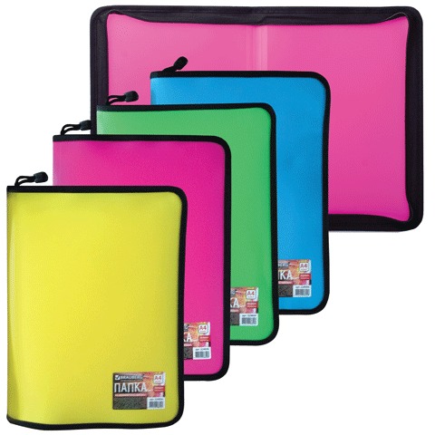 Папка на молнии пластиковая BRAUBERG, А4, 325х230 мм, 4 цвета ассорти, неоновая, 224054