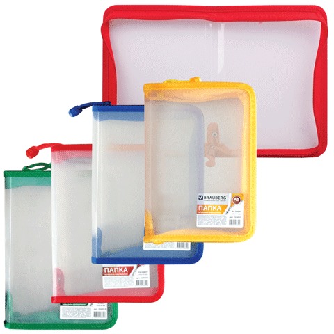 Папка на молнии пластиковая BRAUBERG, "Диагональ", А5, 235х165 мм, прозрачная, молния ассорти, 224053