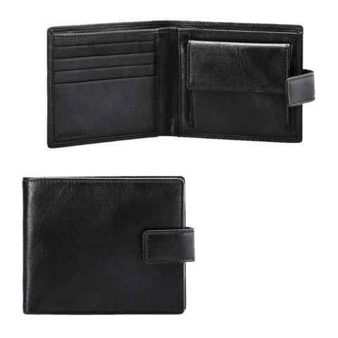 Компактное мужское портмоне выполнено из натуральной кожи. Закрывается хлястиком на кнопку.