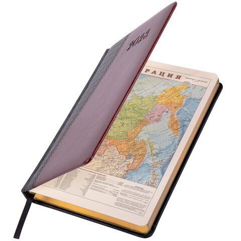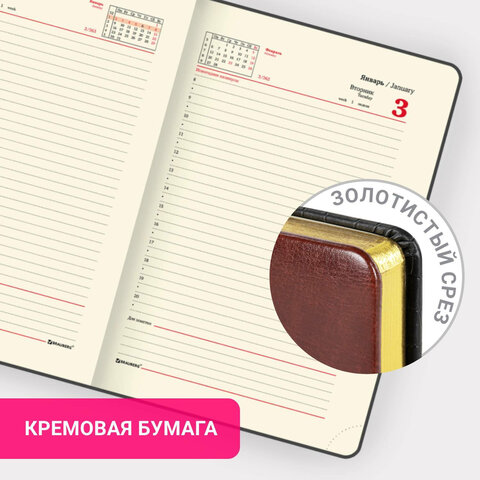 Внутренний блок включает 168 листов тонированной бумаги плотностью 70 г/м2. Каждая страничка имеет перфорированный угол. Благодаря стандартному формату А5 (138х213 мм) ежедневник удобно использовать как в офисе, так и на выездных деловых встречах. Твердая обложка состоит из двух материалов и стилизована под кожу крокодила в сочетании с гладкой кожей. Подходит для горячего тиснения. Срез ежедневника фольгирован золотой фольгой, что придает ему особый шарм. Форзац ежедневника представлен картами мира и России. Дополнением является закладка-ляссе, с помощью которой при необходимости можно быстро открыть ежедневник на нужной странице. Помимо прочего, ежедневник снабжен обширным справочным материалом. Выполнен в благородном коричневом цвете.