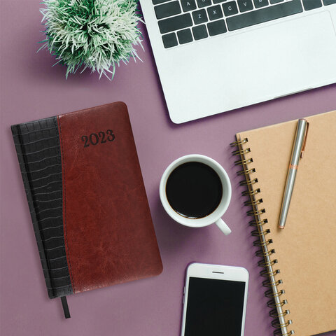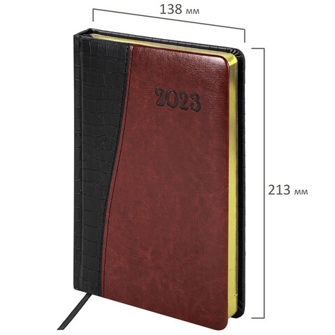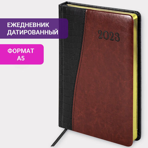 Ежедневник датированный 2023 А5 138x213 мм BRAUBERG "Cayman", под кожу, черный/коричневый, 114014