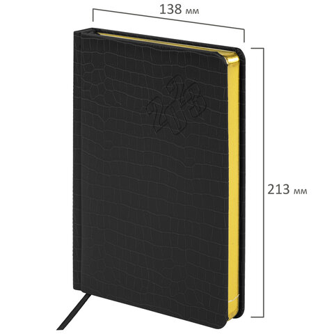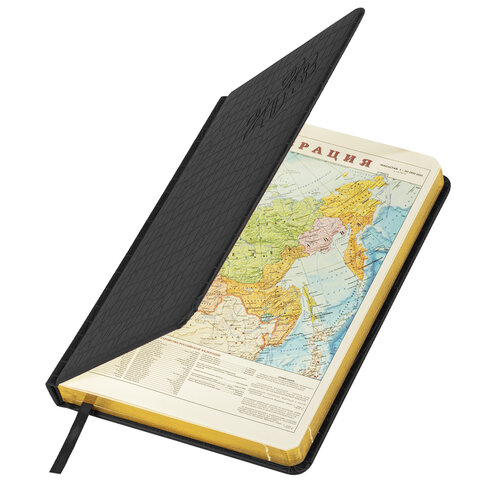 Внутренний блок включает 168 листов тонированной бумаги плотностью 70 г/м2. Каждая страничка имеет перфорированный угол. Благодаря стандартному формату А5 (138х213 мм) ежедневник удобно использовать как в офисе, так и на выездных деловых встречах. Твердая обложка стилизована под кожу крокодила. Материал обложки черного цвета подходит для горячего тиснения. Форзац ежедневника представлен картами мира и России. Срез ежедневника фольгирован золотой фольгой, что придает ему особый шарм. Дополнением является закладка-ляссе, с помощью которой при необходимости можно быстро открыть ежедневник на нужной странице. Помимо прочего, ежедневник снабжен обширным справочным материалом.
