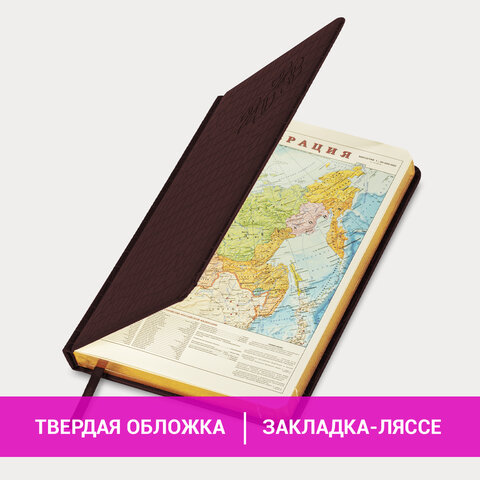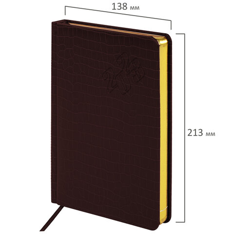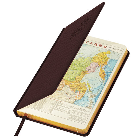 Внутренний блок включает 168 листов тонированной бумаги плотностью 70 г/м2. Каждая страничка имеет перфорированный угол. Благодаря стандартному формату А5 (138х213 мм) ежедневник удобно использовать как в офисе, так и на выездных деловых встречах. Твердая обложка стилизована под кожу крокодила. Материал обложки благородного коричневого цвета подходит для горячего тиснения. Форзац ежедневника представлен картами мира и России. Срез ежедневника фольгирован золотой фольгой, что придает ему особый шарм. Дополнением является закладка-ляссе, с помощью которой при необходимости можно быстро открыть ежедневник на нужной странице. Помимо прочего, ежедневник снабжен обширным справочным материалом.