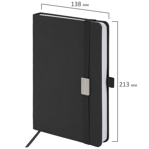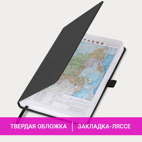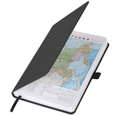 Внутренний блок включает 168 листов белой бумаги плотностью 70 г/м2. Каждая страничка имеет перфорированный угол. Благодаря стандартному формату А5 (138х213 мм) ежедневник удобно использовать как в офисе, так и на выездных деловых встречах. Жесткая книжная обложка классического черного цвета стилизована под искусственную кожу с мелким рисунком, фиксируется резинкой, поэтому ежедневник не откроется в сумке или портфеле и страницы не помнутся. Материал обложки подходит для горячего тиснения. Для удобства пользования ежедневник снабжен держателем для фиксации ручки. Форзац ежедневника представлен картами мира и России. Дополнением является закладка-ляссе, с помощью которой при необходимости можно быстро открыть ежедневник на нужной странице. Помимо прочего, ежедневник снабжен обширным справочным материалом.