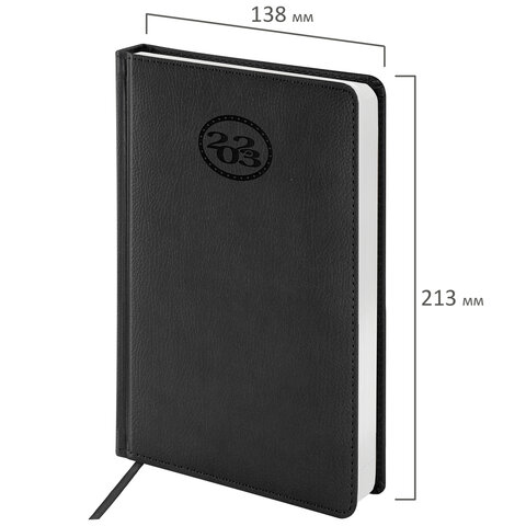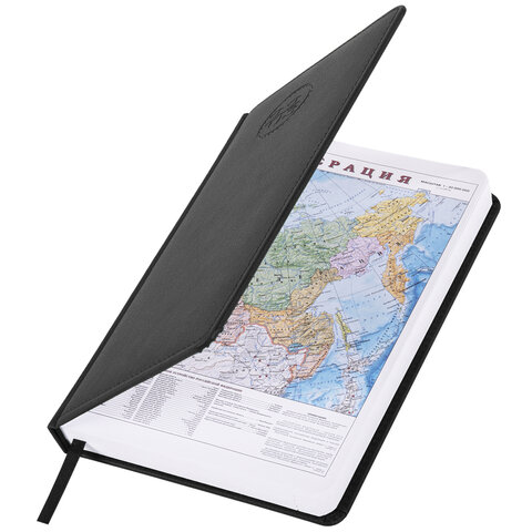 Внутренний блок включает 168 листов белой бумаги плотностью 70 г/м2. Каждая страничка имеет перфорированный угол. Благодаря стандартному формату А5 ежедневник удобно использовать как в офисе, так и на выездных деловых встречах. Обложка с прошивкой по периметру имеет ярко выраженную текстуру под кожу, приятную на ощупь. Материал обложки подходит для горячего тиснения. Форзац ежедневника представлен картами мира и России. Дополнением является закладка-ляссе, с помощью которой при необходимости можно быстро открыть ежедневник на нужной странице. Помимо прочего, ежедневник снабжен обширным справочным материалом. Выполнен в классическом черном цвете.