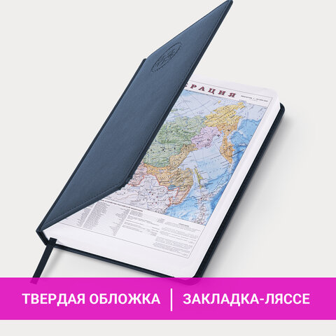 Внутренний блок включает 168 листов белой бумаги плотностью 70 г/м2. Каждая страничка имеет перфорированный угол. Благодаря стандартному формату А5 ежедневник удобно использовать как в офисе, так и на выездных деловых встречах. Обложка с прошивкой по периметру имеет ярко выраженную текстуру под кожу, приятную на ощупь. Материал обложки подходит для горячего тиснения. Форзац ежедневника представлен картами мира и России. Дополнением является закладка-ляссе, с помощью которой при необходимости можно быстро открыть ежедневник на нужной странице. Помимо прочего, ежедневник снабжен обширным справочным материалом. Выполнен в насыщенном темно-синем цвете.