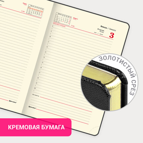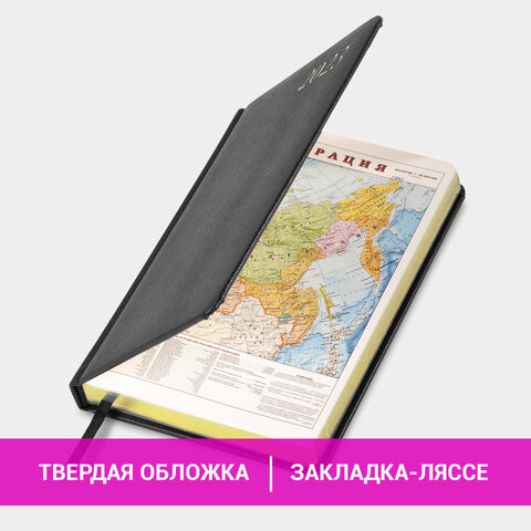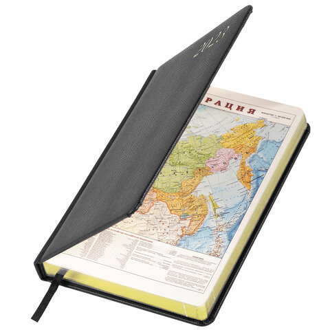 Внутренний блок включает 168 листов тонированной бумаги плотностью 70 г/м2. Каждая страничка имеет перфорированный угол. Благодаря стандартному формату А5 (138х213 мм) ежедневник удобно использовать как в офисе, так и на выездных деловых встречах. Твердая обложка стилизована под кожу рептилии классического черного цвета. Подходит для горячего тиснения. Срез ежедневника фольгирован золотой фольгой, что придает ему особый шарм. Форзац ежедневника представлен картами мира и России. Дополнением является закладка-ляссе, с помощью которой при необходимости можно быстро открыть ежедневник на нужной странице. Помимо прочего, ежедневник снабжен обширным справочным материалом.