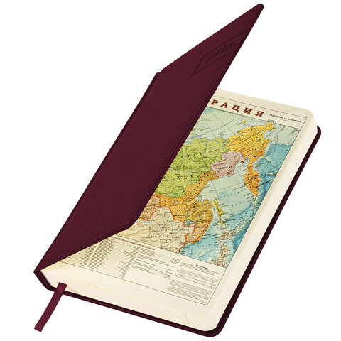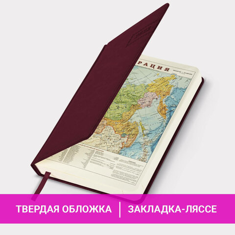 Внутренний блок включает 168 листов тонированной бумаги плотностью 70 г/м2. Каждая страничка имеет перфорированный угол. Благодаря стандартному формату А5 ежедневник удобно использовать как в офисе, так и на выездных деловых встречах. Твердая обложка прошита по периметру, с легкой рельефной фактурой, напоминающей натуральную кожу. Материал обложки подходит для горячего тиснения. Форзац ежедневника представлен картами мира и России. Дополнением является закладка-ляссе, с помощью которой при необходимости можно быстро открыть ежедневник на нужной странице. Помимо прочего, ежедневник снабжен обширным справочным материалом. Выполнен в благородном бордовом цвете.