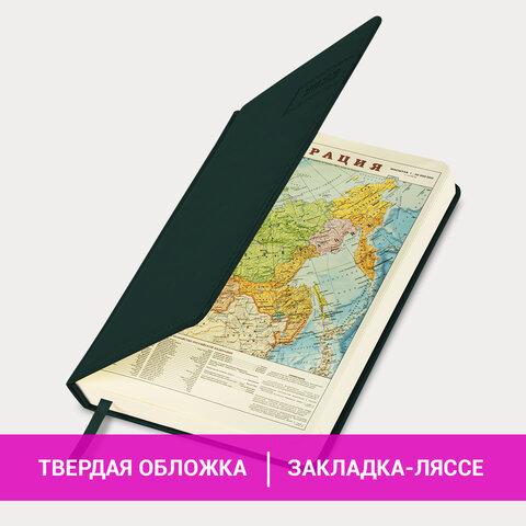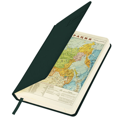 Внутренний блок включает 168 листов тонированной бумаги плотностью 70 г/м2. Каждая страничка имеет перфорированный угол. Благодаря стандартному формату А5 (138х213 мм) ежедневник удобно использовать как в офисе, так и на выездных деловых встречах. Твердая обложка стилизована под гладкую кожу зеленого цвета. Материал обложки подходит для горячего тиснения. Форзац ежедневника представлен картами мира и России. Дополнением является закладка-ляссе, с помощью которой при необходимости можно быстро открыть ежедневник на нужной странице. Помимо прочего, ежедневник снабжен обширным справочным материалом.
