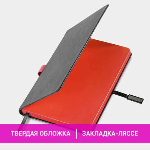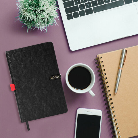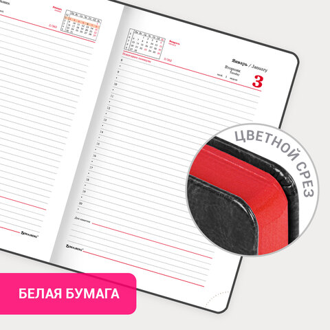 Внутренний блок включает 168 листов белой бумаги плотностью 70 г/м2. Каждая страничка имеет перфорированный угол. Благодаря стандартному формату А5 (138х213 мм) ежедневник удобно использовать как в офисе, так и на выездных деловых встречах. Твердая обложка стилизована под гладкую кожу черного цвета. Материал обложки подходит для горячего тиснения. Для удобства пользования ежедневник снабжен держателем для ручки. Цветной срез в контраст обложки придает ежедневнику особый шарм. Дополнением является закладка-ляссе, с помощью которой при необходимости можно быстро открыть ежедневник на нужной странице. Помимо прочего, ежедневник снабжен обширным справочным материалом.