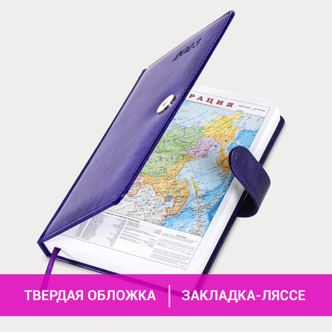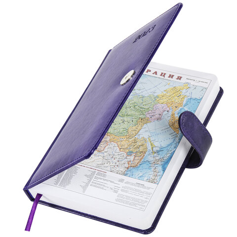 Внутренний блок включает 168 листов белой бумаги плотностью 70 г/м2. Каждая страничка имеет перфорированный угол. Благодаря стандартному формату А5 (138х213 мм) датированный ежедневник удобно использовать как в офисе, так и на выездных деловых встречах. Жесткая книжная обложка, прошитая по периметру, с легкой рельефной фактурой, напоминающей натуральную кожу, фиксируется магнитной застежкой, поэтому ежедневник не откроется в сумке или портфеле и страницы не помнутся. Материал обложки подходит для горячего тиснения. Форзац ежедневника представлен картами мира и России. Дополнением является закладка-ляссе, с помощью которой при необходимости можно быстро открыть ежедневник на нужной странице. Помимо прочего, ежедневник снабжен обширным справочным материалом. Выполнен в благородном фиолетовом цвете.