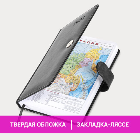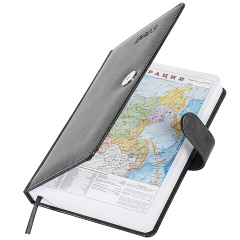 Внутренний блок включает 168 листов белой бумаги плотностью 70 г/м2. Каждая страничка имеет перфорированный угол. Благодаря стандартному формату А5 (138х213 мм) датированный ежедневник удобно использовать как в офисе, так и на выездных деловых встречах. Жесткая книжная обложка, прошитая по периметру, с легкой рельефной фактурой, напоминающей натуральную кожу, фиксируется магнитной застежкой, поэтому ежедневник не откроется в сумке или портфеле и страницы не помнутся. Материал обложки подходит для горячего тиснения. Форзац ежедневника представлен картами мира и России. Дополнением является закладка-ляссе, с помощью которой при необходимости можно быстро открыть ежедневник на нужной странице. Помимо прочего, ежедневник снабжен обширным справочным материалом. Выполнен в благородном сером цвете.