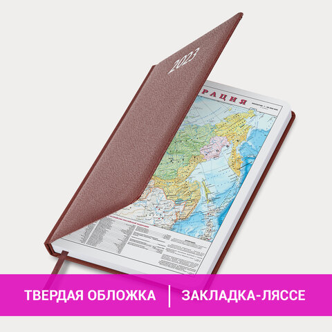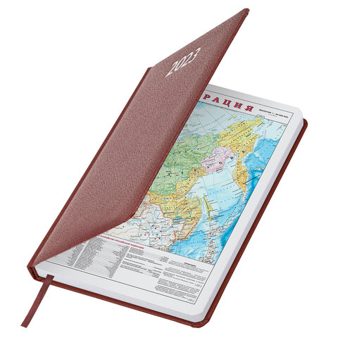 Внутренний блок включает 168 листов белой бумаги плотностью 70 г/м2. Каждая страничка имеет перфорированный угол. Благодаря стандартному формату А5 (138х213 мм) ежедневник удобно использовать как в офисе, так и на выездных деловых встречах. Жесткая книжная обложка с легкой рельефной фактурой напоминает натуральную кожу. Материал обложки - балакрон, подходит для тиснения только фольгой. Форзац ежедневника представлен картами мира и России. Дополнением является закладка-ляссе, с помощью которой при необходимости можно быстро открыть ежедневник на нужной странице. Помимо прочего, ежедневник снабжен обширным справочным материалом.