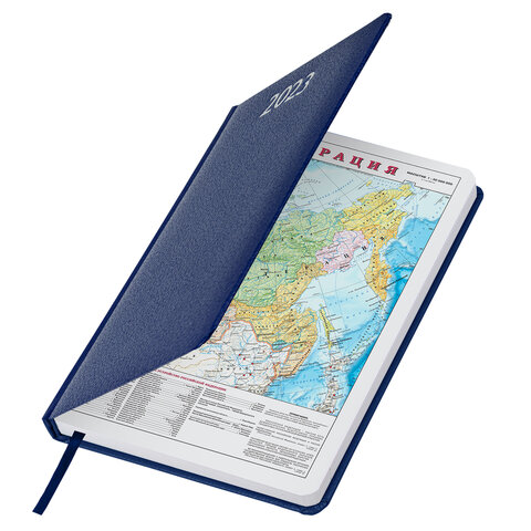 Внутренний блок включает 168 листов белой бумаги плотностью 70 г/м2. Каждая страничка имеет перфорированный угол. Благодаря стандартному формату А5 (138х213 мм) ежедневник удобно использовать как в офисе, так и на выездных деловых встречах. Жесткая книжная обложка с легкой рельефной фактурой напоминает натуральную кожу благородного синего цвета. Материал обложки - балакрон, подходит для тиснения только фольгой. Форзац ежедневника представлен картами мира и России. Дополнением является закладка-ляссе, с помощью которой при необходимости можно быстро открыть ежедневник на нужной странице. Помимо прочего, ежедневник снабжен обширным справочным материалом.