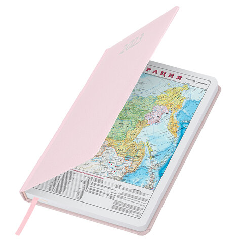 Внутренний блок включает 168 листов белой бумаги плотностью 70 г/м2. Каждая страничка имеет перфорированный угол. Благодаря стандартному формату А5 (138х213 мм) ежедневник удобно использовать как в офисе, так и на выездных деловых встречах. Жесткая книжная обложка с легкой рельефной фактурой напоминает натуральную кожу нежного светло-розового цвета. Материал обложки - балакрон, подходит для тиснения только фольгой. Форзац ежедневника представлен картами мира и России. Дополнением является закладка-ляссе, с помощью которой при необходимости можно быстро открыть ежедневник на нужной странице. Помимо прочего, ежедневник снабжен обширным справочным материалом.