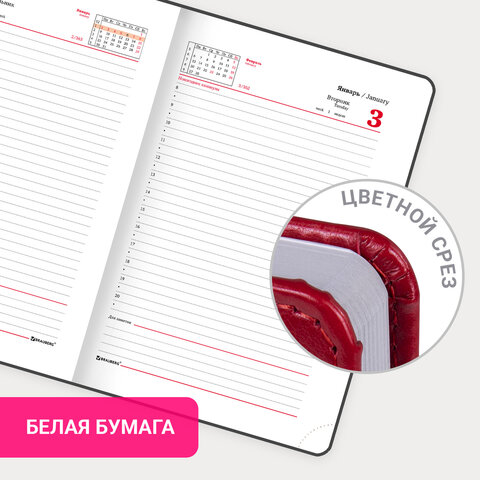 Внутренний блок включает 168 листов белой бумаги плотностью 70 г/м2. Каждая страничка имеет перфорированный угол. Благодаря стандартному формату А5 (138х213 мм) ежедневник удобно использовать как в офисе, так и на выездных деловых встречах. Твердая обложка стилизована под гладкую кожу. Подходит для горячего тиснения. Срез и форзац ежедневника окрашены на контрасте с цветом обложки, что придает ему особый шарм. Дополнением является закладка-ляссе, с помощью которой при необходимости можно быстро открыть ежедневник на нужной странице. Помимо прочего, ежедневник снабжен обширным справочным материалом.