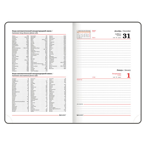 Внутренний блок включает 168 листов белой бумаги плотностью 70 г/м2. Каждая страничка имеет перфорированный угол. Благодаря стандартному формату А5 (138х213 мм) ежедневник удобно использовать как в офисе, так и на выездных деловых встречах. Жесткая книжная обложка с легкой рельефной фактурой напоминает натуральную кожу классического черного цвета. Материал обложки - балакрон, подходит для тиснения только фольгой. Форзац ежедневника представлен картами мира и России. Дополнением является закладка-ляссе, с помощью которой при необходимости можно быстро открыть ежедневник на нужной странице. Помимо прочего, ежедневник снабжен обширным справочным материалом.