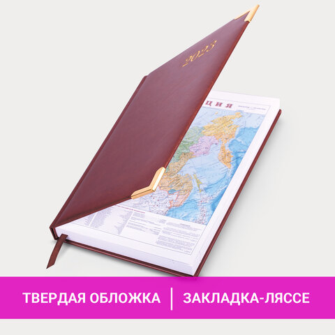 Внутренний блок включает 168 листов белой бумаги плотностью 70 г/м2. Каждая страничка имеет перфорированный угол. Благодаря стандартному формату А5 (138х213 мм) ежедневник удобно использовать как в офисе, так и на выездных деловых встречах. Твердая обложка стилизована под гладкую кожу благородного коричневого цвета. Подходит для горячего тиснения. Ежедневник имеет металлические уголки, что придает ему особый шарм. Форзац ежедневника представлен картами мира и России. Дополнением является закладка-ляссе, с помощью которой при необходимости можно быстро открыть ежедневник на нужной странице. Помимо прочего, ежедневник снабжен обширным справочным материалом.