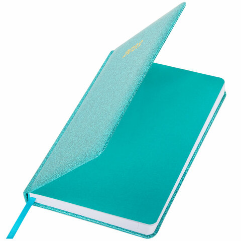 Внутренний блок включает 168 листов белой бумаги плотностью 70 г/м2. Каждая страничка имеет перфорированный угол. Благодаря стандартному формату А5 (138х213 мм) ежедневник удобно использовать как в офисе, так и на выездных деловых встречах. Твердая обложка стилизована под кожу с глиттером неординарного бирюзового цвета. Подходит для тиснения фольгой. Дополнением является закладка-ляссе, с помощью которой при необходимости можно быстро открыть ежедневник на нужной странице. Помимо прочего, ежедневник снабжен справочным материалом.