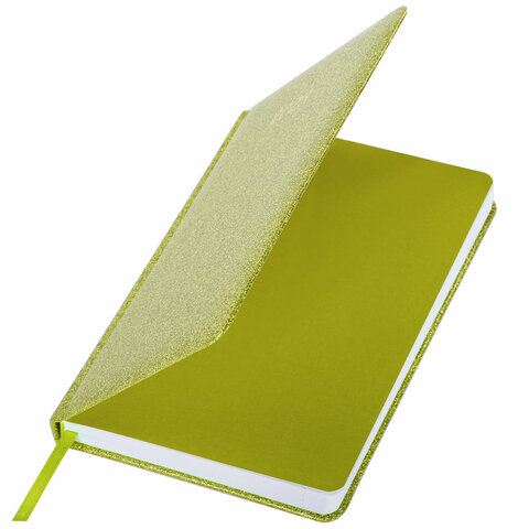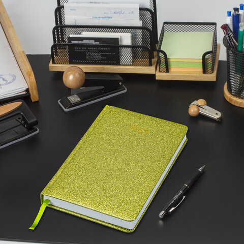Внутренний блок включает 168 листов белой бумаги плотностью 70 г/м2. Каждая страничка имеет перфорированный угол. Благодаря стандартному формату А5 (138х213 мм) ежедневник удобно использовать как в офисе, так и на выездных деловых встречах. Твердая обложка стилизована под кожу с глиттером. Подходит для тиснения фольгой. Дополнением является закладка-ляссе, с помощью которой при необходимости можно быстро открыть ежедневник на нужной странице. Помимо прочего, ежедневник снабжен справочным материалом.