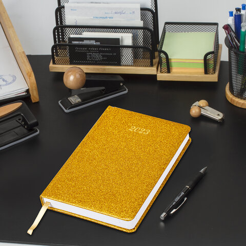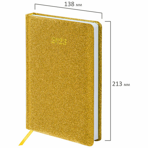 Ежедневник датированный 2023 А5 138x213 мм BRAUBERG "Sparkle", под кожу, блестки, золотистый, 114110