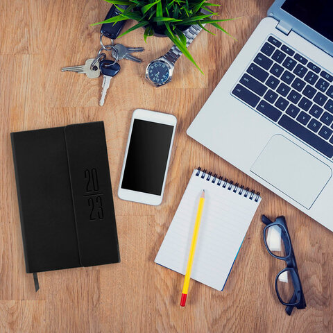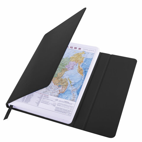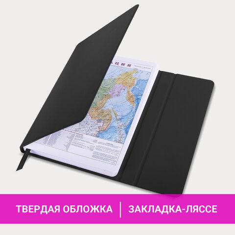 Внутренний блок включает 168 листов белой бумаги плотностью 70 г/м2. Каждая страничка имеет перфорированный угол. Благодаря стандартному формату А5 (138х213 мм) ежедневник удобно использовать как в офисе, так и на выездных деловых встречах. Твердая обложка, стилизованная под гладкую кожу, фиксируется магнитным клапаном, поэтому ежедневник не откроется в сумке или портфеле и страницы не помнутся. Подходит для горячего тиснения. Форзац ежедневника представлен картами мира и России. Дополнением является закладка-ляссе, с помощью которой при необходимости можно быстро открыть ежедневник на нужной странице. Помимо прочего, ежедневник снабжен обширным справочным материалом. Выполнен в классическом черном цвете.