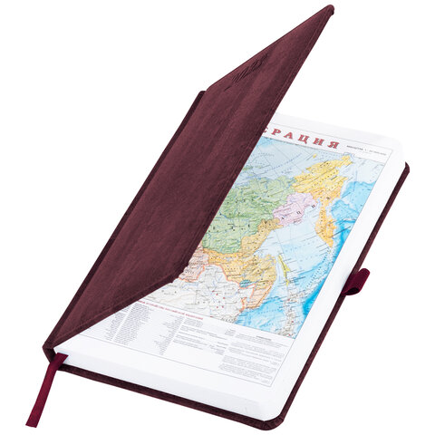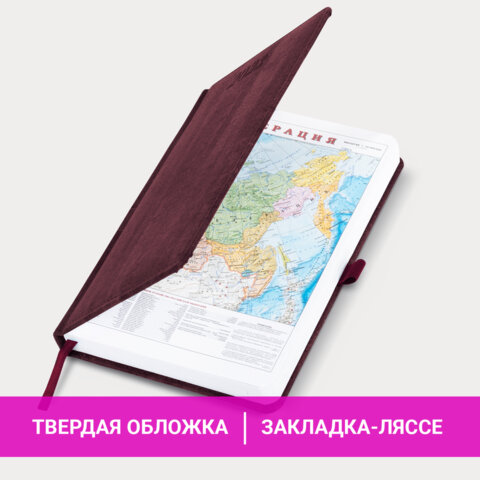 Внутренний блок включает 168 листов белой бумаги плотностью 70 г/м2. Каждая страничка имеет перфорированный угол. Благодаря стандартному формату А5 (138х213 мм) ежедневник удобно использовать как в офисе, так и на выездных деловых встречах. Твердая обложка стилизована под благородное дерево и выполнена в стильном бордовом цвете. Подходит для горячего тиснения. Снабжен резинкой-фиксатором, благодаря чему ежедневник не откроется в сумке или портфеле. Дополнением является закладка-ляссе, с помощью которой при необходимости можно быстро открыть ежедневник на нужной странице и держатель для ручки. Помимо прочего, ежедневник снабжен справочным материалом.