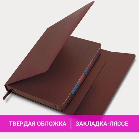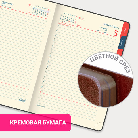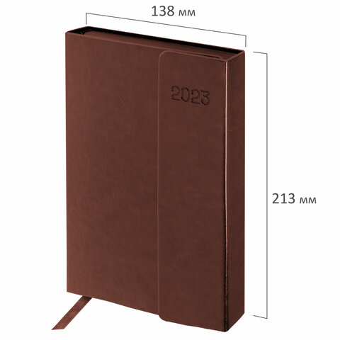 Внутренний блок включает 168 листов тонированной бумаги плотностью 70 г/м2. Каждая страничка имеет перфорированный угол. Благодаря стандартному формату А5 (148х218 мм) ежедневник удобно использовать как в офисе, так и на выездных деловых встречах. Интегральная обложка стилизована под гладкую кожу благородного коричневого цвета, фиксируется магнитным клапаном, поэтому ежедневник не откроется в сумке или портфеле и страницы не помнутся. Подходит для горячего тиснения. Срез и форзац ежедневника окрашены в цвет обложки, что придает ему особый шарм. Дополнением является закладка-ляссе, с помощью которой при необходимости можно быстро открыть ежедневник на нужной странице, а также вырубка по месяцам. Помимо прочего, ежедневник снабжен обширным справочным материалом.