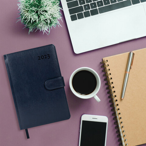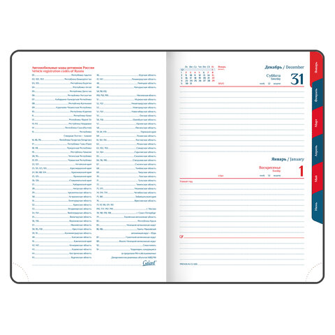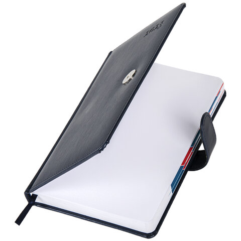 Внутренний блок включает 168 листов белой бумаги плотностью 70 г/м2. Каждая страничка имеет перфорированный угол. Благодаря стандартному формату А5 (148х218 мм) ежедневник удобно использовать как в офисе, так и на выездных деловых встречах. Твердая обложка, прошитая по периметру, стилизованная под гладкую кожу, фиксируется магнитной застежкой, поэтому ежедневник не откроется в сумке или портфеле и страницы не помнутся. Материал обложки подходит для горячего тиснения. Дополнением является закладка-ляссе, с помощью которой при необходимости можно быстро открыть ежедневник на нужной странице, а также вырубка по месяцам. Помимо прочего, ежедневник снабжен обширным справочным материалом. Выполнен в классическом темно-синем цвете.
