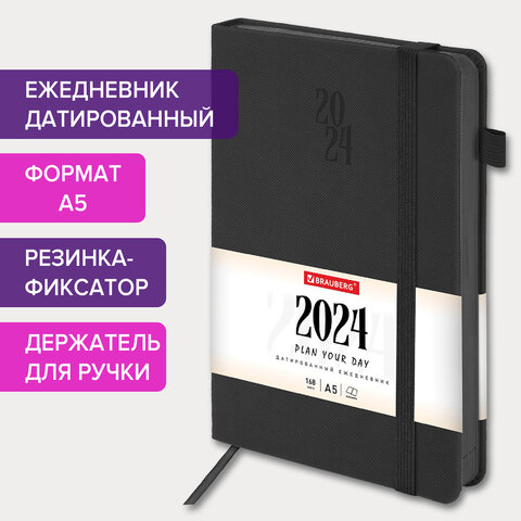 Ежедневник датированный 2024 А5 138х213 мм BRAUBERG "Plain", под кожу, с резинкой, черный, 114997