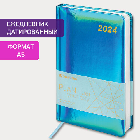 Ежедневник датированный 2024 А5 138x213 мм, BRAUBERG "Holiday", под кожу, "зеркальный", бирюза, 114843
