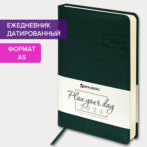 Ежедневник датированный 2024 А5 138x213 мм, BRAUBERG "Imperial", под кожу, зеленый, 114860