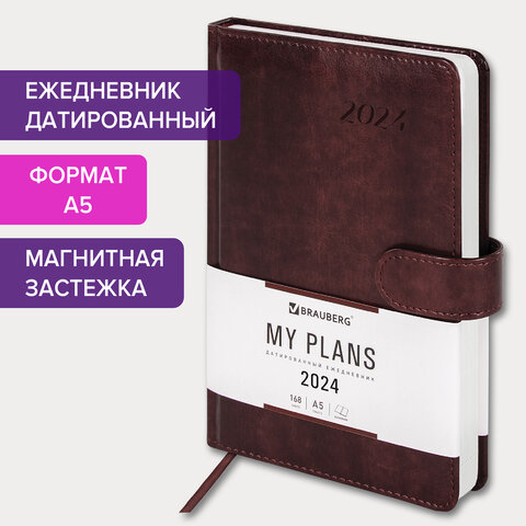 Ежедневник датированный 2024 А5 138x213 мм BRAUBERG "Legend", под кожу, застежка, коричневый, 114863