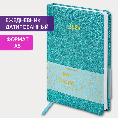 Ежедневник датированный 2024 А5 138x213 мм, BRAUBERG "Sparkle", под кожу, блестки, бирюзовый, 114931