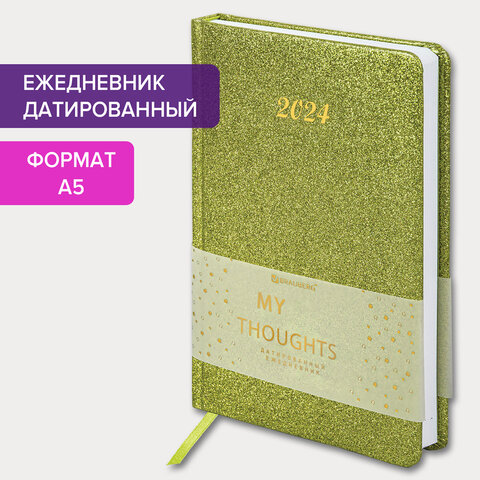 Ежедневник датированный 2024 А5 138x213 мм, BRAUBERG "Sparkle", под кожу, блестки, зеленый, 114933