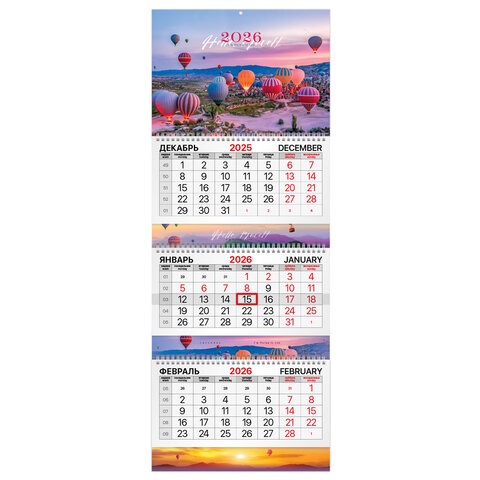 Календарь квартальный 2026 г., 3 блока, 3 гребня, бегунок, мелованная бумага, BRAUBERG EXTRA, "Каппадокия", 116815