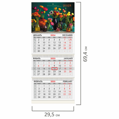 Календарь квартальный на 2025 г., 3 блока, 3 гребня, с бегунком, мелованная бумага, BRAUBERG, "Прекрасные цветы", 116136