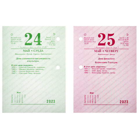 Блок календаря на 2023 год напечатан на газетной бумаге плотностью 55 г/м2 в одну краску с выделением цветом четырех сезонов. На всех листах указана справочная информация: календарь на текущий месяц, часы восхода и захода солнца, долгота дня, лунный календарь, праздники. Имеет государственную тематику. Вертикальное расположение. Размер - 10х14 см. Поставляется в индивидуальной упаковке.