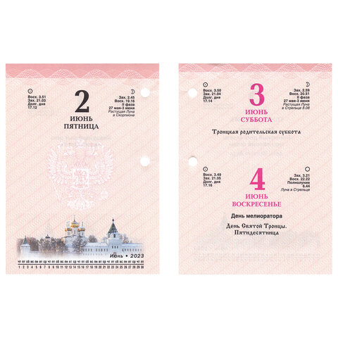Блок календаря на 2023 год напечатан на офсетной бумаге плотностью 60 г/м2 в четыре краски с выделением цветом выходных и праздничных дней. Справочная информация на 160 листах: календарь на текущий месяц, часы восхода и захода солнца, долгота дня, лунный календарь, праздники. Имеет государственную тематику. Вертикальное расположение. Размер - 10х14 см. Поставляется в индивидуальной упаковке.