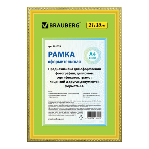 Рамка BRAUBERG "HIT5", 21х30 см, пластик, золото (для дипломов и сертификатов), 391074