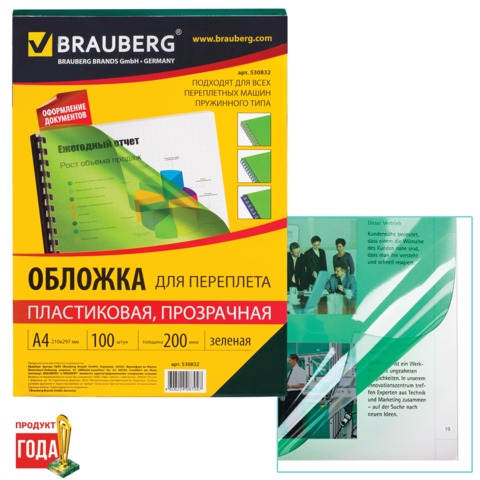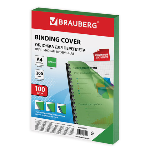 Обложки для переплета BRAUBERG, комплект 100 шт., А4, пластик 200 мкм, прозрачно-зеленые, 530832