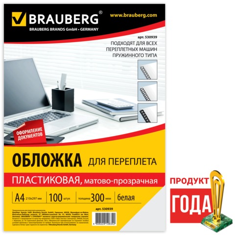 Обложки для переплета BRAUBERG, комплект 100 шт., А4, пластик 300 мкм, белые, 530939